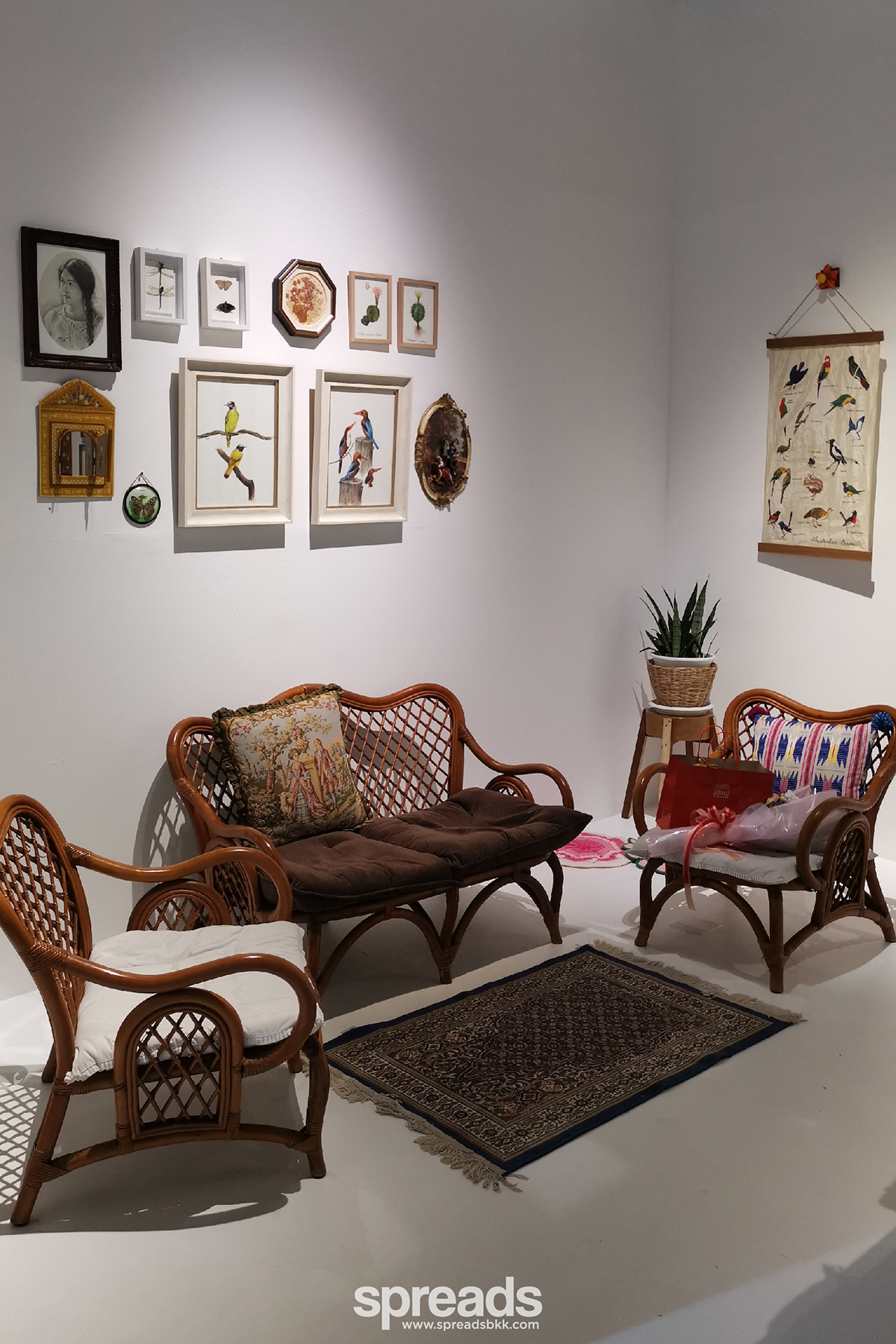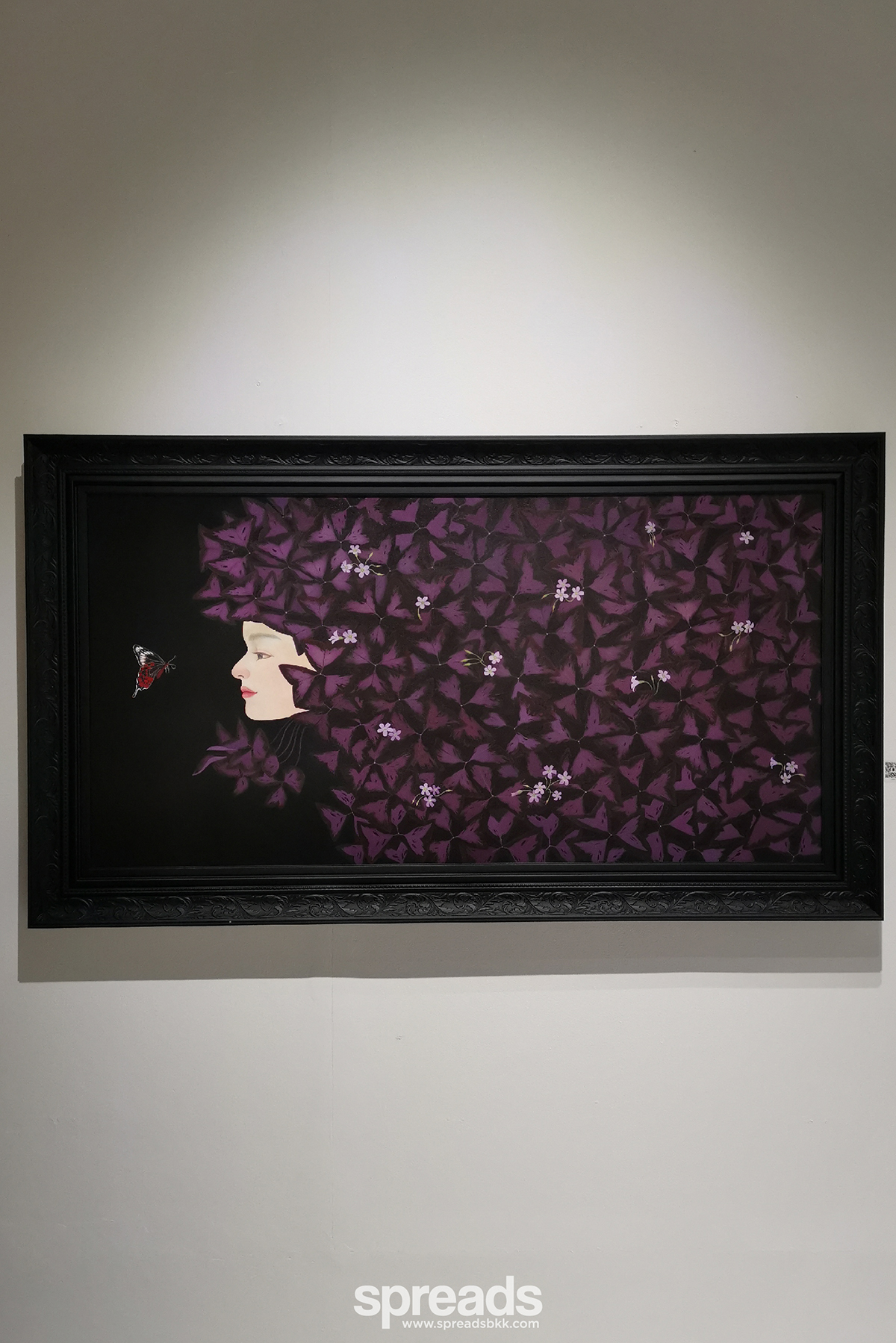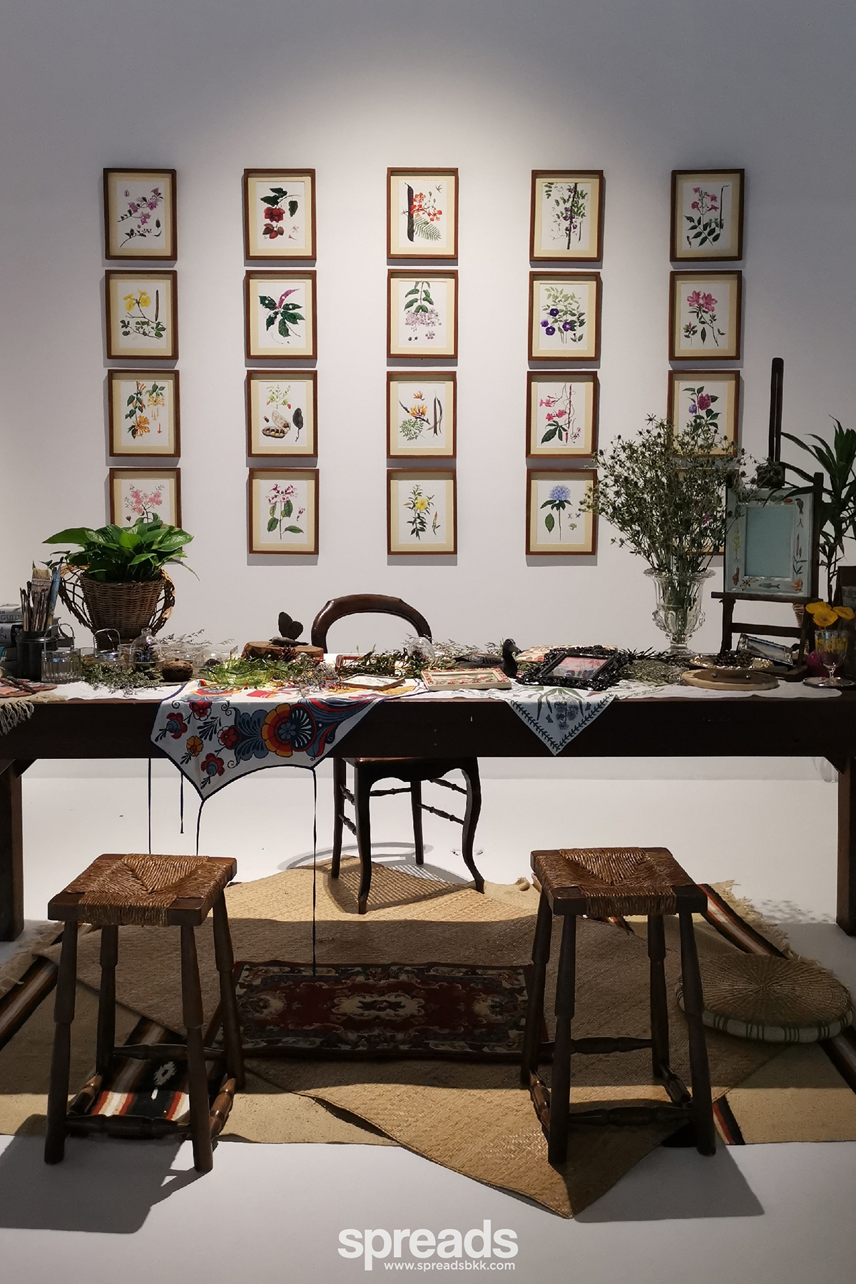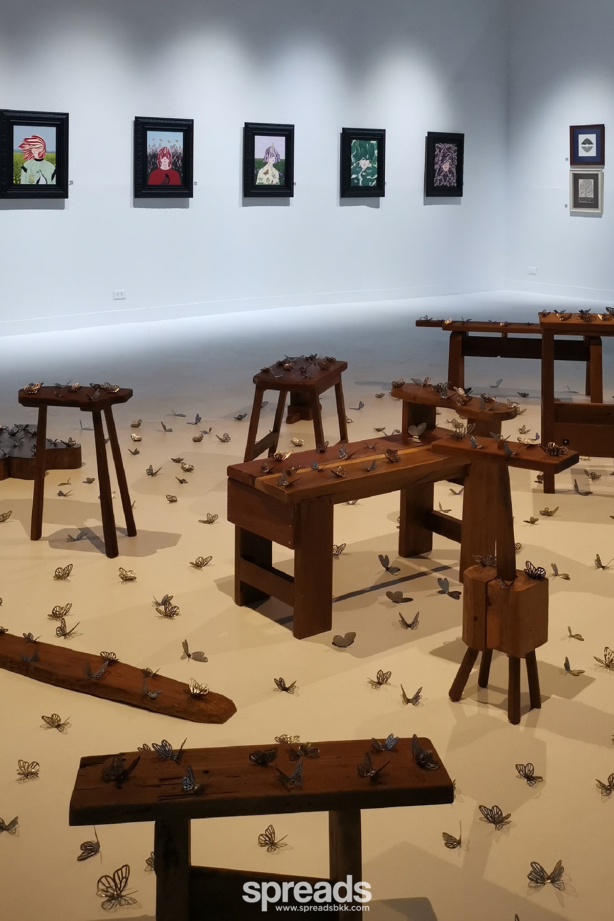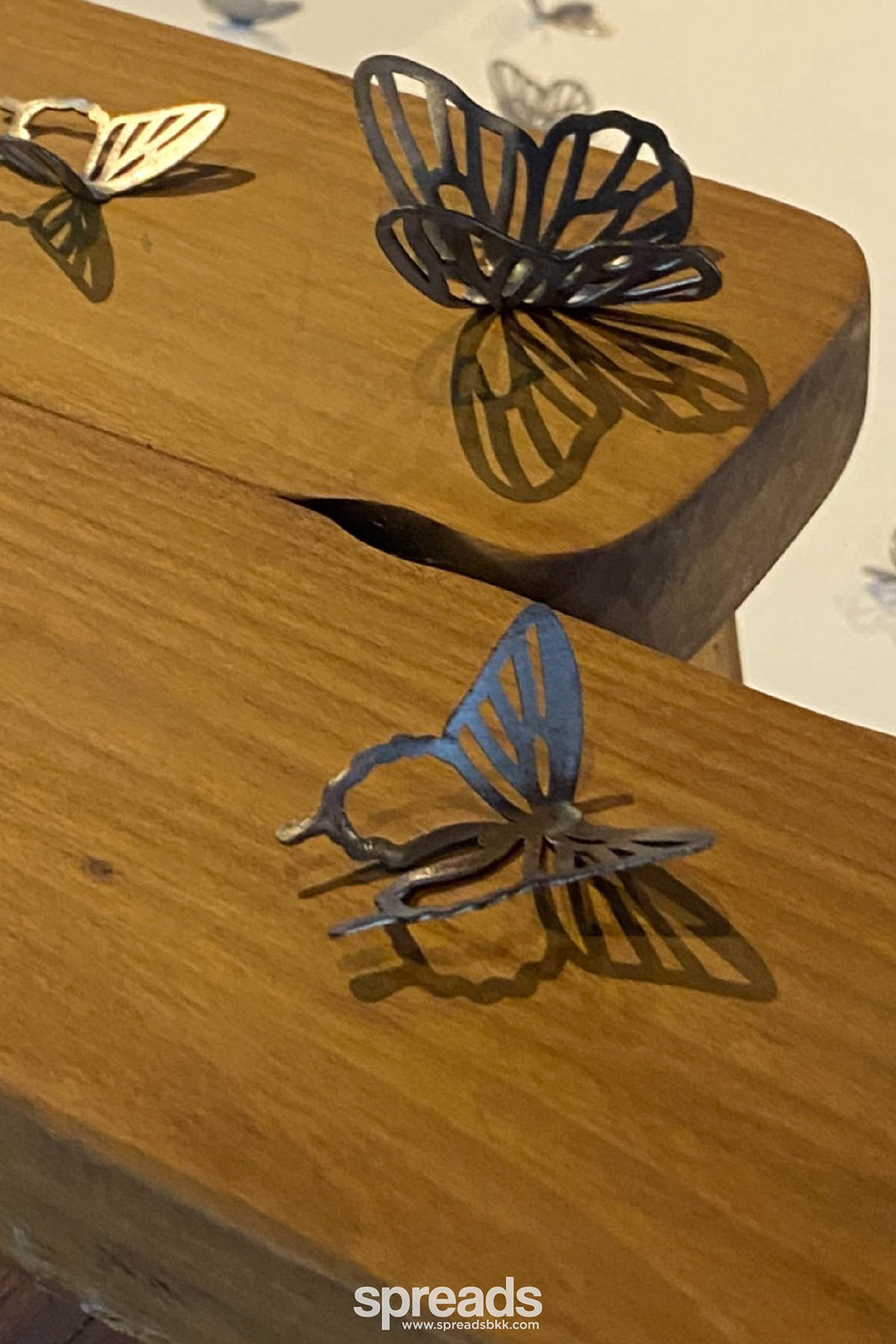 ที่เป็นไฮไลท์ของงานเห็นจะหนีไม่พ้นโต๊ะไม้ที่จัดวางรวมกลุ่มกลางห้องนิทรรศการ แถมยังแต่งแต้มเรียงรายไปด้วยผีเสื้อเหล็กที่จัดวางอยู่กระจัดกระจาย ห้องด้านในสุดยังจัดคล้ายห้องนั่งเล่นไว้รับแขกของศิลปิน ซึ่งให้บรรยากาศคล้ายกับสตูดิโอของเธอที่เชียงราย เพราะเธอยกของตกแต่ง และเฟอร์นิเจอร์จากที่โน่นมาวางที่นี่ด้วยจริงๆ