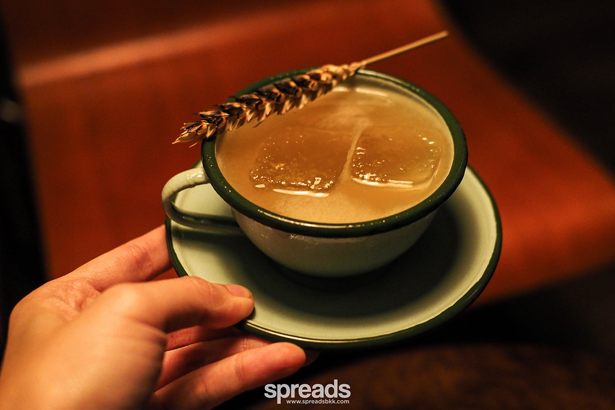 และอีกตัวที่เราชิมคือ Farm to Home เสิร์ฟใส่ถ้วยน่ารักกุ๊กกิ๊ก แต่เด่นเรื่องกลิ่นสโมคของ Mezcal กับบรรดาส่วนผสมสายพืชผักอย่าง honey barley syrup, grapefruit juice และcelery bitter