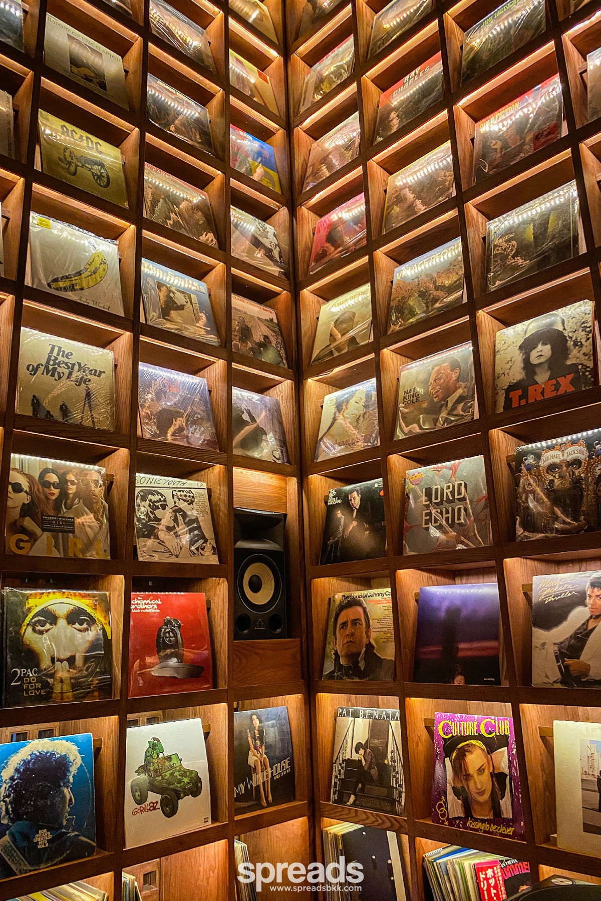 แต่ที่เก๋สุดคือมุมหน้าร้าน ที่มีบูทเครื่องเล่นแผ่นเสียงเป็นชั้นไม้วางไวนิลสูงจรดเพดาน ทะลุต่อไปเต็มชั้นสอง มีแผ่นหลากหลายเรียงเต็มทุกช่อง