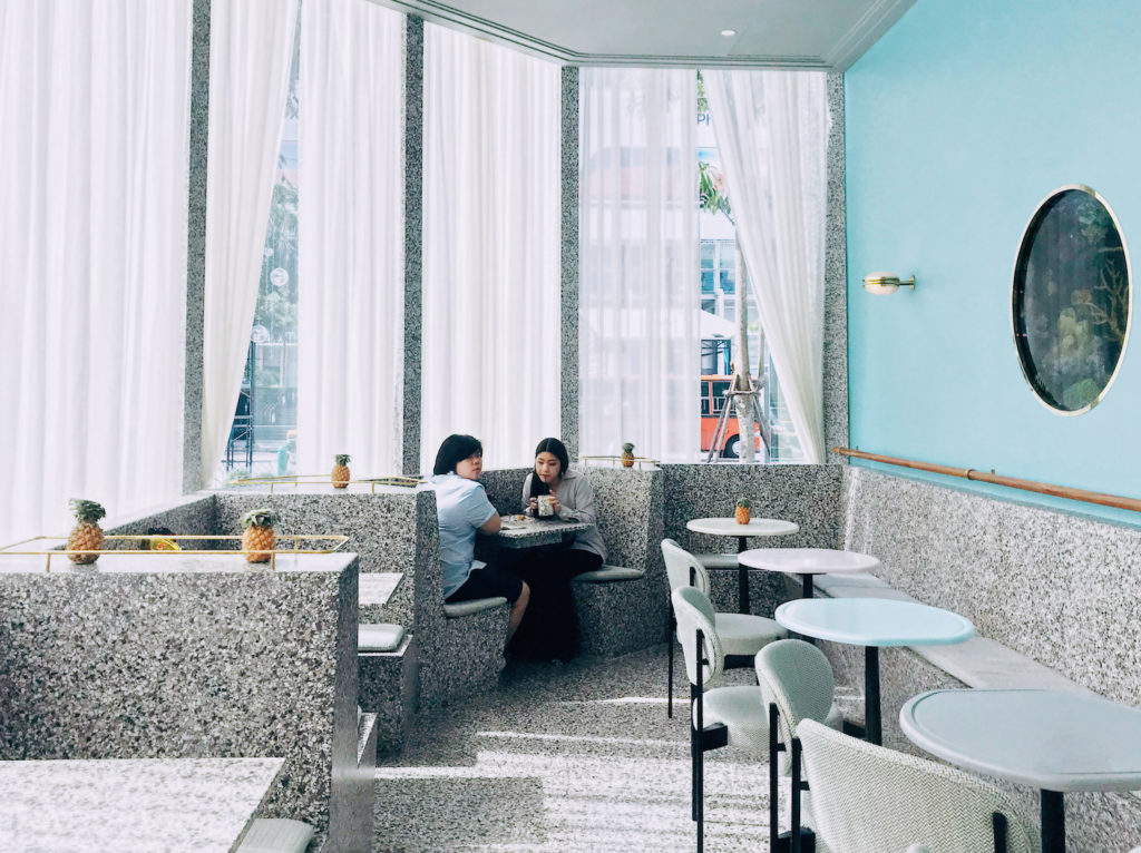 ร้านเน้นใช้สีพาสเทลเป็นหลัก โดดเด่นด้วยพื้นหินเทอร์ราซโซสีสบายตา บวกกับตู้ปลาเล็กๆ ติดผนัง และแสงแดดที่พุ่งเข้าร้านอย่างพอดี ทำให้บรรยากาศเหมาะมากที่จะนั่งดื่มกาแฟไปด้วยโพสท่าถ่ายรูปไปด้วย นอกจากนี้ร้านก็ยังเต็มไปด้วยรายละเอียดเล็กๆ แต่สะดุดตา อย่างโคมไฟปลาหลากสี และแก้วน้ำโมเสกสีสดใส ดูไปดูมาก็ราวกับเราเข้าไปท่องอยู่ในโลกใต้น้ำที่เต็มไปด้วยปลาน้อยใหญ่ท่ามกลางหินหลากสีส่องแสงระยิบระยับ