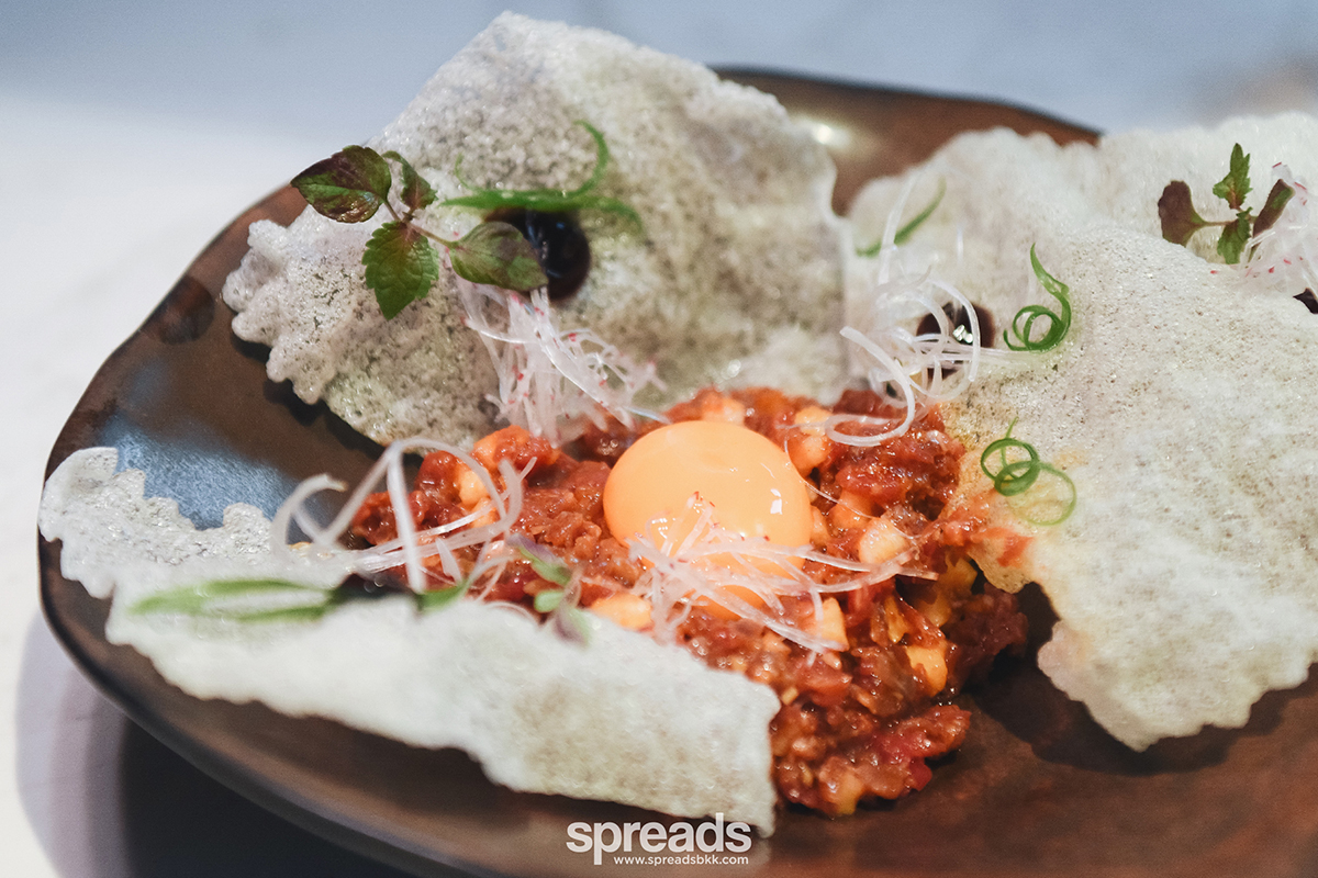 เราก็เลยจะเจอจานแบบ beef tartare ที่ปรุงแบบตะวันออก มีกลิ่นน้ำมันงา รสโกชูจังบาง ๆ มีงาโรย ทั้งยังมีลูกแพร์กรอบหวาน หั่นเป็นเต๋าเล็กให้ไม่กวนรสชาติเนื้อเกินไปนัก คลุกรวมกันกับไข่แดงแล้วทั้งคำมาครบทั้งความฉ่ำ ความหนักแน่นของรสเนื้อ ที่ได้ความเบาสดชื่น กินคู่กับข้าวเกรียบเนื้อกรอบเบาเข้ากันดีมาก!