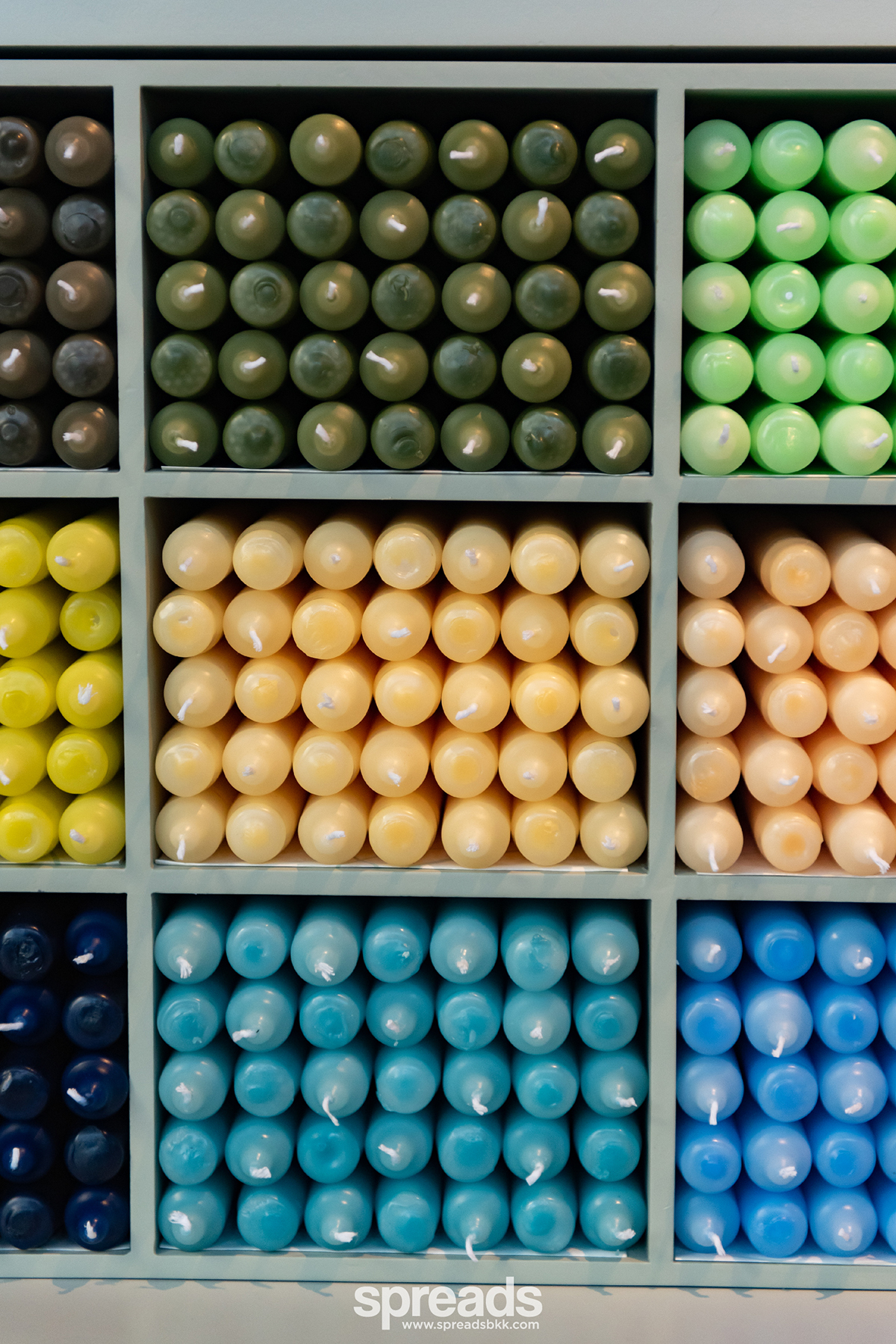 นั่นคือเหตุผลที่ร้านเทียนของเธอมีความหลากหลายตั้งแต่รูปแบบ กลิ่น และสีสันถึง 40 Pantone โดยเฉพาะเทียนทรงซิกเนเจอร์อย่างเทียนวันเกิดที่เธอเลือกมาเป็นสินค้าอย่างแรก และทำออกมามากถึง 18 สี แต่ไม่ได้แพ็ครวมกันเหมือนเทียนวันเกิดที่เราคุ้นเคย ทำให้สามารถเลือกแมทช์สีสันที่ชอบ ไล่สีเป็นเฉด หรือจะเหมาสีเดียวสุดโปรดไปเลยก็ได้ แถมเทียนทรงนี้ยังหล่อมาจากแม่พิมพ์วินเทจที่นำเข้าจากเยอรมนีเมื่อ 40 ปีมาแล้ว และราคาเริ่มต้นเพียงแท่งละ 12 บาท