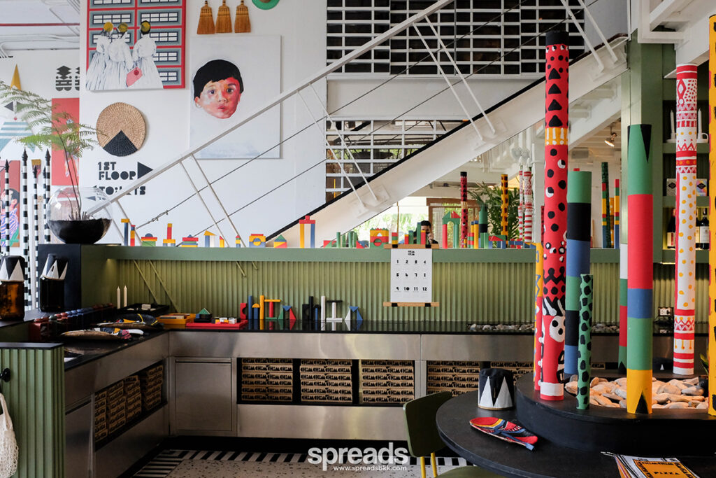 นั่นเป็นแค่ฝั่งเดียวของร้าน พอเดินเข้ามาหลังเคาน์เตอร์ก็ยังมีอีกโซนที่แสงไม่เข้ามาตรง ๆ แต่หน้าต่างบานสูงรอบร้านก็ใหญ่พอที่จะทำให้สว่างไปทุกมุมแบบไม่ร้อน โซนนี้สีไม่จัดจ้านเท่า แต่เน้นเล่นลายแพตเทิร์นทั้งบนหมอนอิง โต๊ะเก้าอี้ทรงต่าง ๆ พรม ไปจนถึงบนผนัง ที่ร้านบอกเราว่าภาพที่ติดอยู่เป็นนิทรรศการที่จะหมุนเวียนไปเรื่อย ๆ ตามคอนเซปต์เน้นศิลปะและงานดีไซน์ของที่นี่ และเราก็ถึงกับร้องอ้อ พอร้านบอกว่าปลอกหมอน ผ้าบุเก้าอี้ และโซฟาลายสวยต่าง ๆ หลายชิ้นมาจากแบรนด์เพื่อนบ้านกันอย่างจิม ทอมป์สัน มิน่าล่ะ ความเยอะแยะทั้งหมดทั้งมวลนี้ไม่มีอะไรเด๋อด๋าออกมาเลย