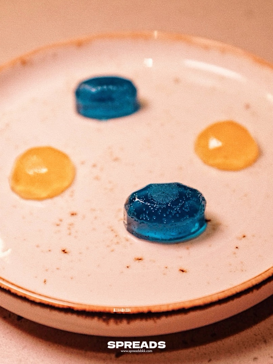 แถมตอนท้ายมื้อ เราได้กินเยลลี่ที่เป็นซิกเนเจอร์ของร้านแล้วอร่อยแบบไม่ทันตั้งตัว เป็นเยลลี่สีเหลืองกับฟ้า ที่พนักงานเล่าว่าเป็นตัวแทนของร้านอาหาร-บาร์ ที่ตั้งอยู่ชั้นล่างของโรงแรมตรงข้ามกัน ชิ้นนึงเป็นกลางวัน อีกชิ้นเป็นกลางคืน แต่รสหวานอมเปรี้ยวสดชื่น ปิดมื้อสวยทั้งคู่