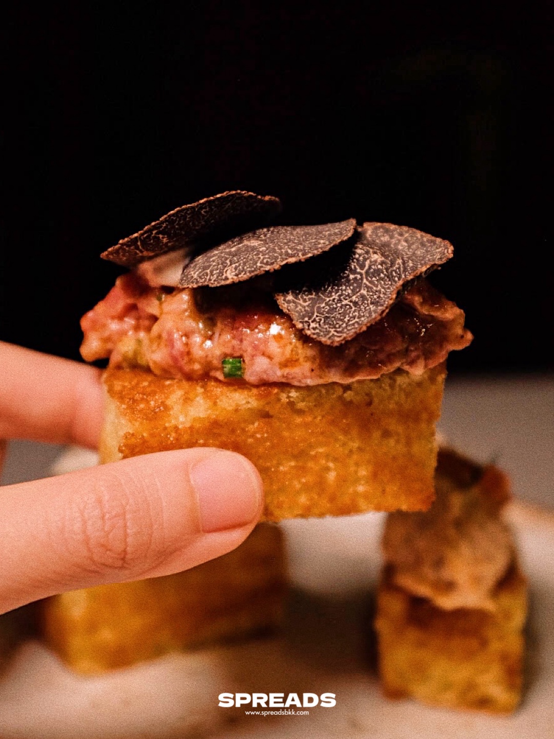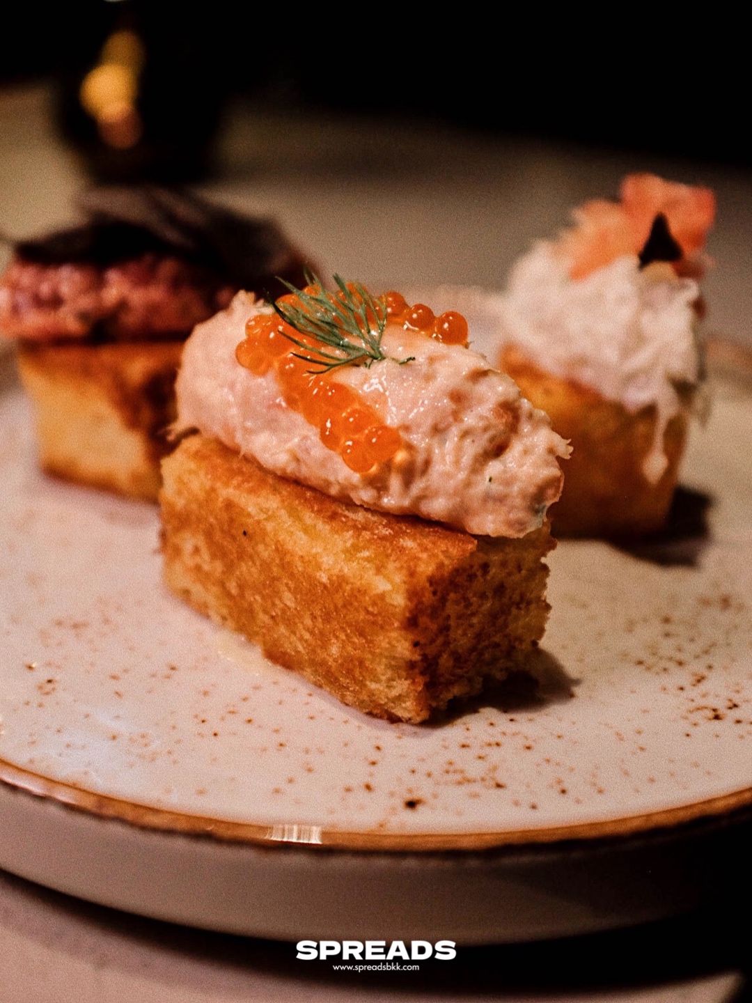 แล้วก็อยากขออวยยศให้จาน Trio of Toast ที่รู้ใจคนตัดสินใจไม่ได้ อยากลองชิมโทสต์หลาย ๆ อย่าง ก็ชิมไปเลยทั้งสาม มีหน้าทาทาร์เนื้อกับทรัฟเฟิล หน้าปู แล้วก็สโมคแซลมอน ชิมแล้วติดใจ Beef Tartare รสเข้มจนคิดว่าถ้ามาคราวหน้าจะสั่งแยกทั้งจานเลย