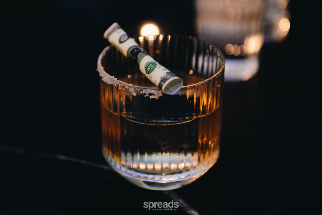 แก้วที่เรายกมงพรีเซนเทชันให้ก่อนเลยคือ Money – Soul ที่พูดถึงประเด็นเงินและจิตวิญญาณ ผ่านทางน้ำตาลแผ่นพิมพ์ลายคล้ายธนบัตร ที่ม้วนอยู่บนปากแก้ว เป็นสัญลักษณ์ที่เชื่อมโยงกับรสชาติขมปลายของแก้วนี้