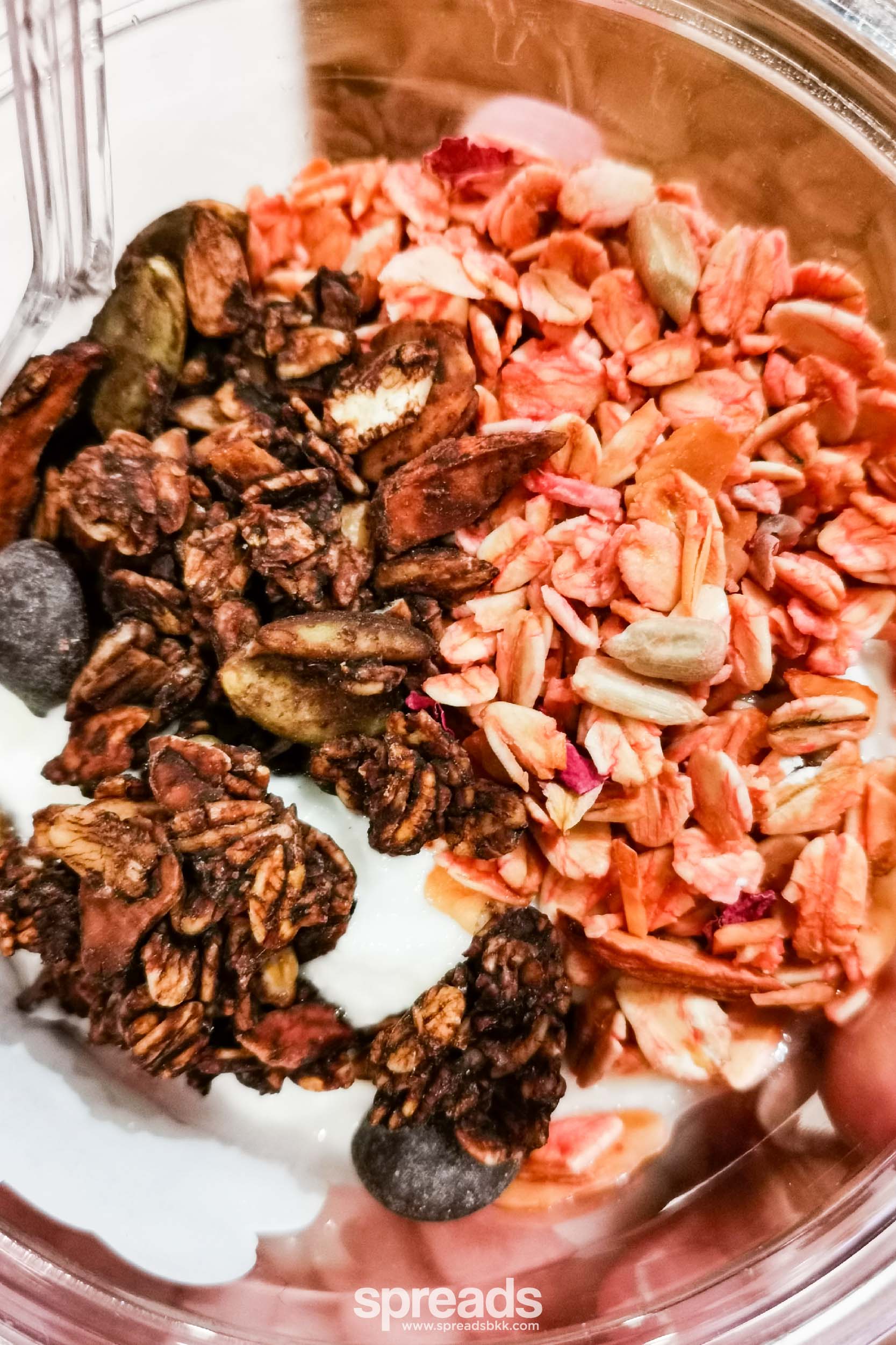 Roses and Rainbow ที่มีทั้งผงสตรอว์เบอร์รีอาบทุกอย่างเป็นสีชมพู เสริมด้วย กลีบกุหลาบแห้ง และผลสตรอว์เบอร์รีแห้งหนึบ ๆ มาเป็นชิ้น