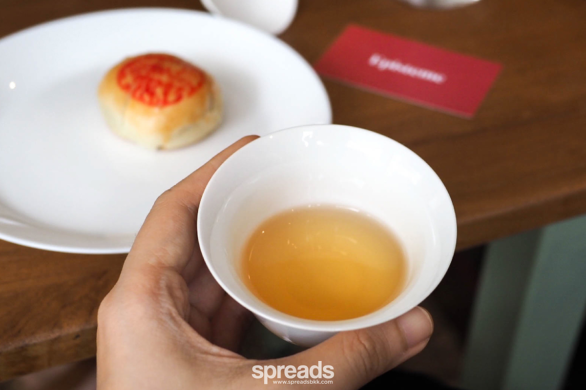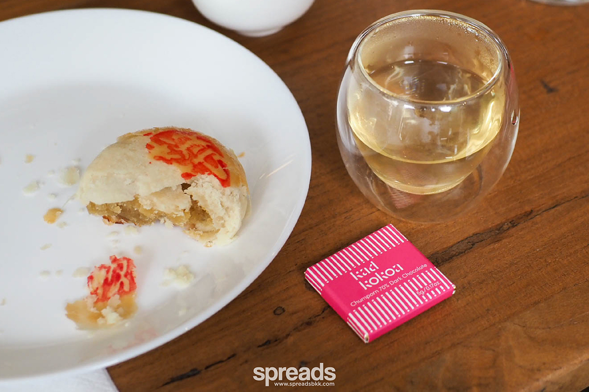 ทั้งหมดทั้งมวลนี้แกล้มด้วยชาจาก Monsoon Tea ซึ่งมีความน่าสนใจตรงที่เป็นชาจากป่า ในภาคเหนือของประเทศไทย ไม่ใช่ชาไร่แบบที่เราคุ้นเคยกันทั่วไป ทำให้มีกลิ่นรสอันเป็นเอกลักษณ์จากแหล่งปลูก ความกลมล่อมจากต้นชาที่อายุมากกว่าตามไร่ปกติ และไม่มีสารเคมี งานนี้ไปป์ หนึ่งในทีมงาน Episteme อาสาชง และพาเราชิมชาขาวรสละมุน ไล่ไปชาเขียว ที่จับคู่กับขนมเปี๊ยะจากร้านเก่าแก่ย่านตลาดน้อยอย่างแต้เล่าจิ้นเส็ง ไปจนถึงอู่หลงกลมกล่อม และชาดำป่าที่รสชาติเด่นเป็นเอกลักษณ์ จนเป็นที่ชื่นชอบของหลายคนในโต๊ะ โดยสองอย่างหลังถูกจับคู่กับช็อกโกแล็ตไทยจาก Kad Kokoa แล้วยังมีเมี่ยงใบชา และคอมบูชาจาก Kombucha bar ของ Monsoon ตบท้ายด้วย