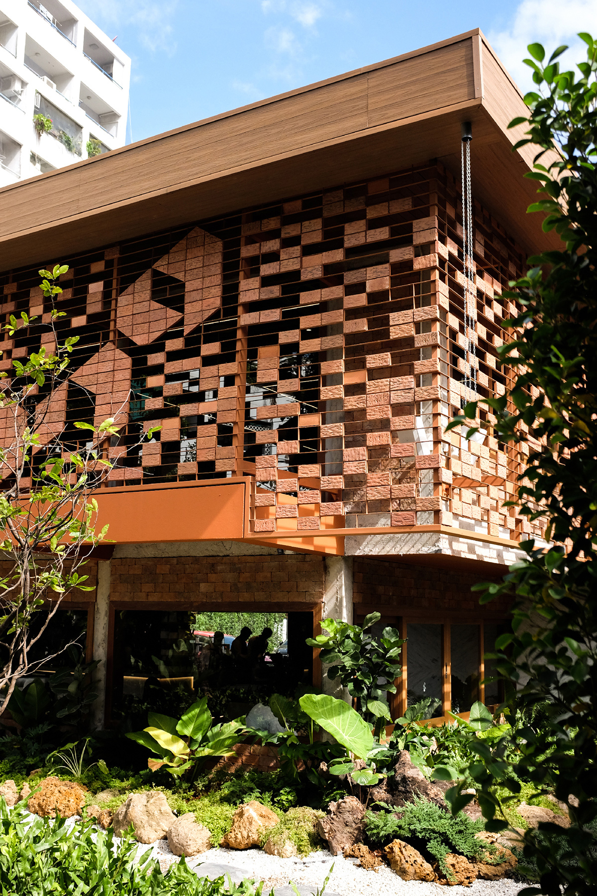 นอกจากสวนเขียวที่กินพื้นที่ครึ่งหนึ่งของร้าน เรายังชอบโครงสร้างครอบตัวบ้านด้านนอกที่ออกแบบเป็นช่องไฟสีส้มลดหลั่น ล้อกับสีกำแพงอิฐชั้นล่างของตัวบ้าน ทำให้แดดแรงๆ ยามบ่ายกลายเป็นแสงนุ่มๆ ลอดผ่านโครงสร้างเข้ามาเพิ่มความอบอุ่น บวกกับเพลง synth/electro-pop ทำให้การมา Nana เหมือนมานั่งบ้านเพื่อนนักออกแบบเท่ๆ สักคน