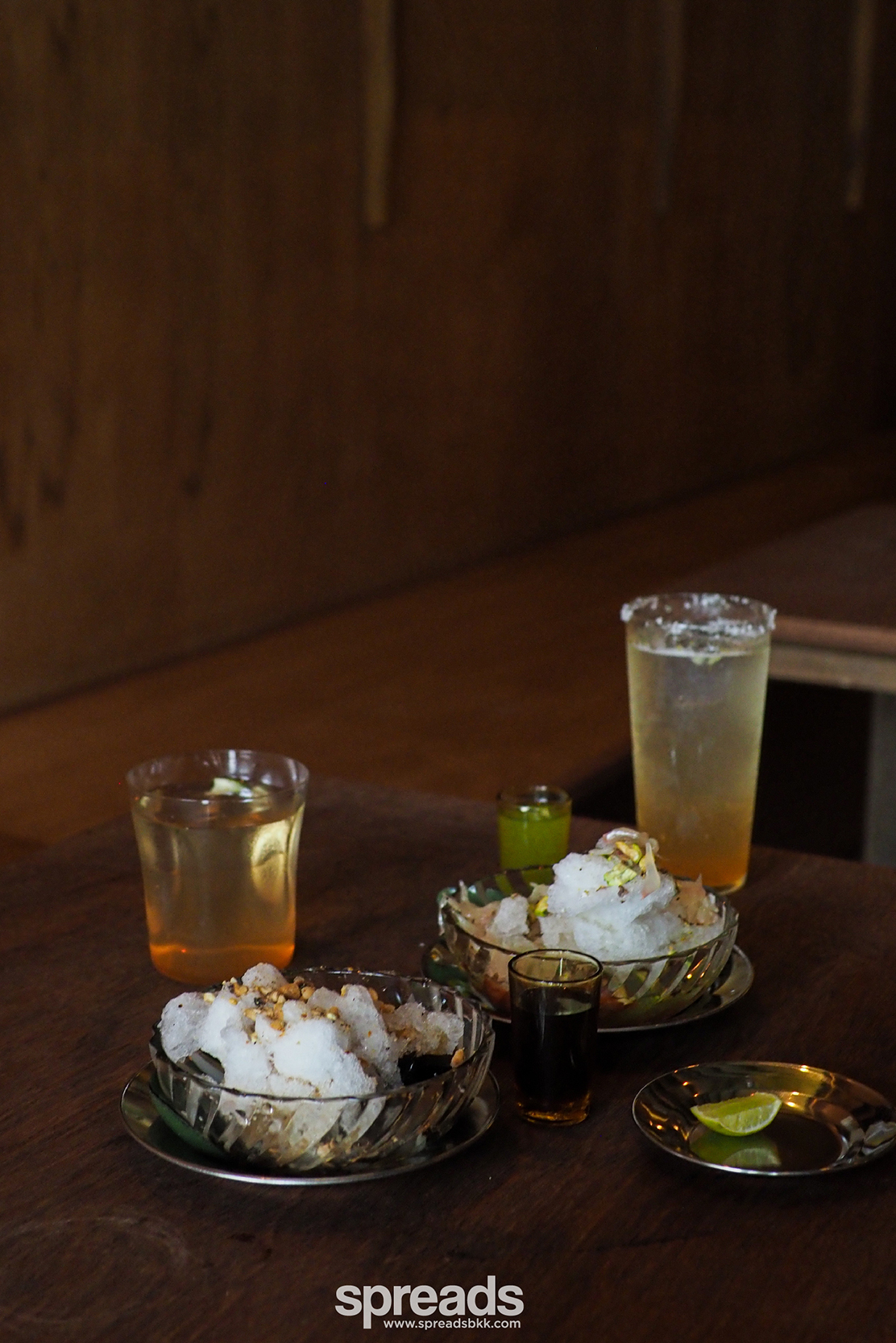 คอมบิเนชันน้ำแข็งไสมาเหนือขนาดนี้ เราก็อดถามไม่ได้ว่าเป็นมายังไง เลยได้ความว่าเป็นร้านน้องสาวของ Ku Bar นี่เอง แน่นอนว่าลิสต์เครื่องดื่มก็ไม่ธรรมดา เราโดนโทนิคทำเองจาก Ku Bar ท้อปโซดา บีบมะนาว หอม หวานอ่อน ๆ ขมแค่ปลาย ในเมนูยังมีชา และเครื่องดื่มสดชื่นอย่างอื่นให้เลือกด้วย